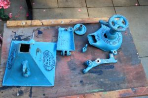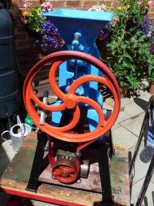 The Bamford KOO mill we have needed a reduction gear box fitted as it was running too fast . We had a couple in stock so found a couple of flat belt pulleys and fitted them to the gear box before fitting that to the mill we need to have a flat belt stitched by a very kind lady we know who has an industrial sewing machine and then we will be able to see if we have slowed it down enough, while we did this we also freshened the paintwork up .